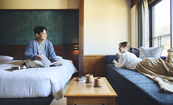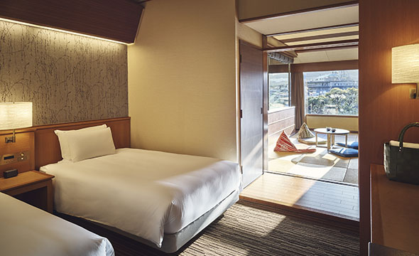 新たに温泉付きのお部屋が新たに誕生しました。ホテルの自家源泉をお好きな時間にお部屋で堪能いただける和室とツインルームがある和洋室タイプのお部屋です。