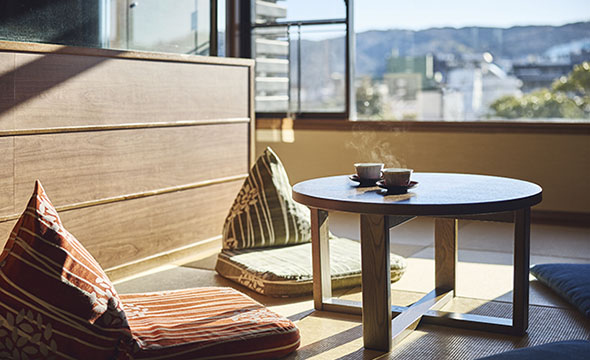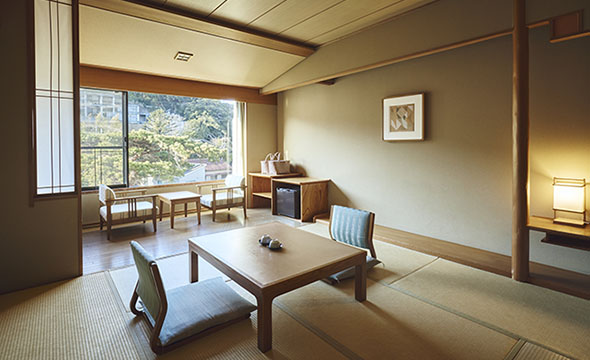 畳で足をのばしておくつろぎいただける、和室ならではのゆったりとした時間をお過ごしいただける、小さなお子様連れのご利用にもおすすめのお部屋です。ベッドスタイルのお部屋もございます。